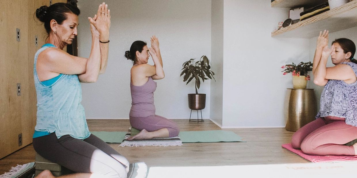 Begin with gentle movements to arrive in your body then focus on still poses supported by props.